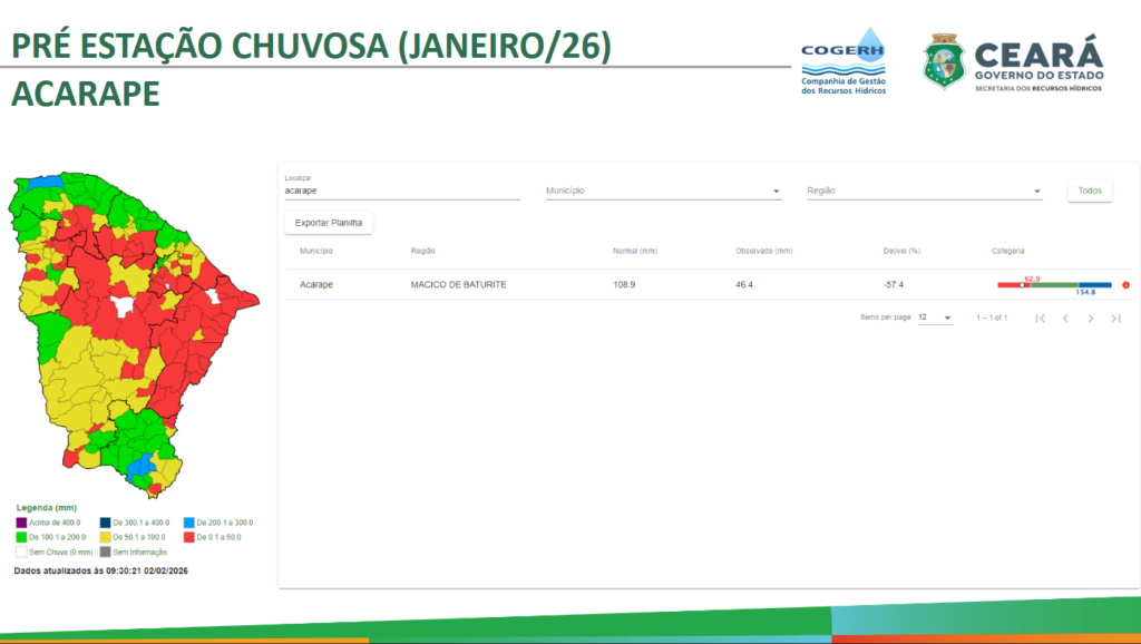 Sobre a situação das chuvas no município de Acarape, o analista informou que o índice normal de precipitação para o mês de janeiro é de 108,9 milímetros. No entanto, até o momento, foram registrados apenas 46,4 milímetros de chuva.