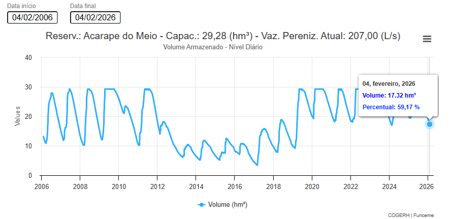 O próximo encontro da Comissão Gestora do Açude Acarape do Meio está previsto para ocorrer entre os meses de julho e agosto de 2026, ocasião em que será definida a alocação de água para o segundo semestre do ano.