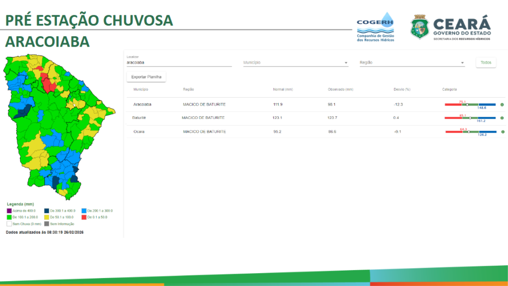 Sobre a situação das chuvas no município de Aracoiaba, André informou que o índice normal de precipitação para o mês de janeiro é de 111,9 milímetros. No entanto, até o momento, foram registrados apenas 98,1 milímetros de chuva.