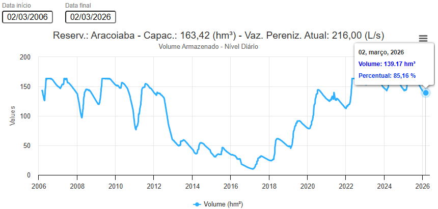 Ele relembrou que, em reunião realizada no dia 1 de julho de 2025, a Comissão Gestora aprovou uma vazão média de 380 litros por segundo, sendo 230 l/s para abastecimento humano e 150 l/s para o rio. Na ocasião, o Açude Aracoiaba registrava 163,42 milhões de metros cúbicos, correspondendo a 100% da sua capacidade.