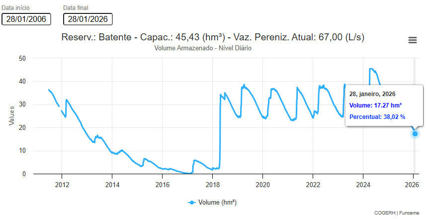 Ele relembrou que, em reunião realizada no dia 2 de julho de 2025, a Comissão Gestora aprovou uma vazão média de 120 litros por segundo, sendo 35 l/s destinados ao abastecimento dos distritos de Ocara e Morada Nova e 85 l/s para a perenização do rio Piranji. Na ocasião, o Açude Batente registrava um volume de 32,57 milhões de metros cúbicos, correspondente a 71,69% de sua capacidade total.